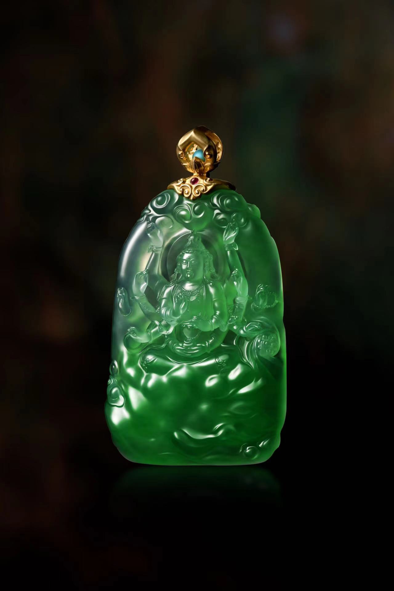 - 作品擅长佛教题材、人物的创作,将佛教精神内涵与玉雕艺术紧密结合,人物造像不失玉雕简洁之美,又不失佛教禅意韵味,将作品的意境美、工艺美展现出来,赋予丰富的寓意和文化内涵。同时,保持翡翠自身的“珠光宝气”,因材施艺,主题鲜明,形象逼真,高贵雅致,超凡脱俗,玉雕作品颇受欢迎。